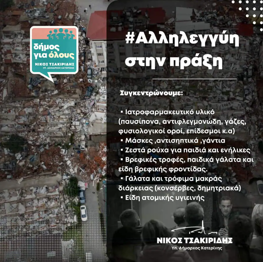 Συγκεντρώνουμε από σήμερα, Τετάρτη 8 Φεβρουαρίου 2023 στα γραφεία μας Εθν. Αντιστάσεως & Ά παρ. Βότση 1 στο κέντρο της Κατερίνης, στον ημιώροφο, είδη πρώτης ανάγκης για τους σεισμόπληκτους της Τουρκίας και της Συρίας και ώρες 9:00 με 13:00 και 17:00 με 20:30.