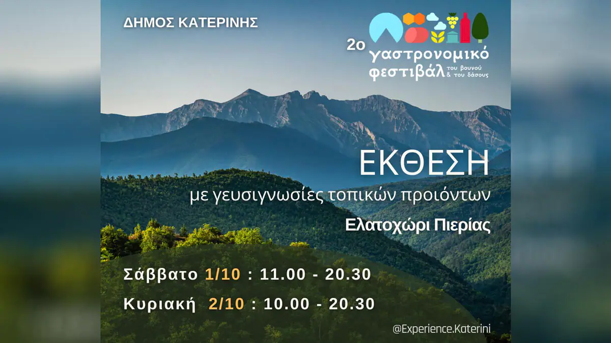 Μετά από το επιτυχημένο 1ο Γαστρονομικό Φεστιβάλ του βουνού και του δάσους, τον Ιούνη του 2022 στον Άγιο Δημήτριο Πιερίας, η Αντιδημαρχία Τουρισμού Δ. Κατερίνης διοργανώνει σε συνεργασία με την ΔΕΕΕΚ/Δημοτικό Ραδιόφωνο Κατερίνης 95.3FM, τον ΟΠΠΑΠ Δ. Κατερίνης και τοπικούς φορείς του Ελατοχωρίου, το 2ο Γαστρονομικό Φεστιβάλ του βουνού και του δάσους με έδρα το πανέμορφο Ελατοχώρι.