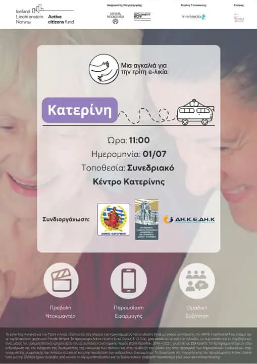 Ανοιχτή εκδήλωση για το κοινό της Κατερίνης με θέμα το δικαίωμα στην ισότιμη πρόσβαση στον ψηφιακό κόσμο για τα άτομα μεγαλύτερης ηλικίας θα πραγματοποιηθεί στο Συνεδριακό Κέντρο Κατερίνης, την Παρασκευή 1 Ιουλίου στις 11:00, από την μη κερδοσκοπική οργάνωση People Behind σε συνεργασία με τον Δήμο Κατερίνης, τον Οργανισμό Πολιτισμού (ΟΠΠΑΠ) του Δήμου Κατερίνης και τη ΔΗ.ΚΕ.ΔΗΚ.