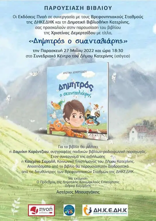 Ο Πρόεδρος της ΔΗΚΕΔΗΚ Αστέριος Μπουσνάκης σε συνεργασία με τις Εκδόσεις Πνοή και τη Δημοτική Βιβλιοθήκη Κατερίνης, σας προσκαλούν την Παρασκευή 27.05.2022 στην παρουσίαση του βιβλίου της Χριστίνας Δεμερτσίδου με τίτλο: “Δημητρός ο σκανταλιάρης”, στο συνεδριακό κέντρο.