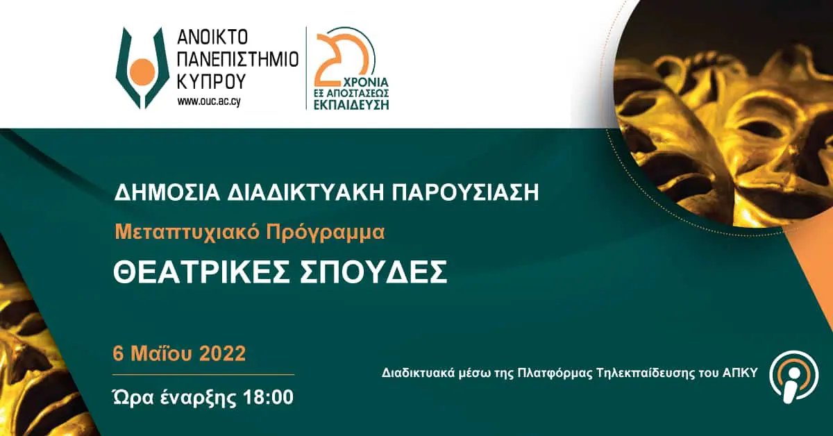 Σε ανοικτή διαδικτυακή εκδήλωση, την Παρασκευή 6 Μαΐου 2022, το Ανοικτό Πανεπιστήμιο Κύπρου (ΑΠΚΥ) παρουσιάζει το αναδιαρθρωμένο Μεταπτυχιακό Πρόγραμμα «Θεατρικές Σπουδές», το οποίο θα προσφερθεί από το ακαδημαϊκό έτος 2022-23 με εμπλουτισμένο περιεχόμενο, αξιολογημένο και πιστοποιημένο από τον Φορέα Διασφάλισης και Πιστοποίησης της Ποιότητας της Ανώτερης Εκπαίδευσης. Η διαδικτυακή παρουσίαση θα αρχίσει στις 18.00 και θα μεταδοθεί ζωντανά μέσω των εργαλείων τηλεκπαίδευσης του ΑΠΚΥ στον σύνδεσμο https://bit.ly/3BqTB7B.
