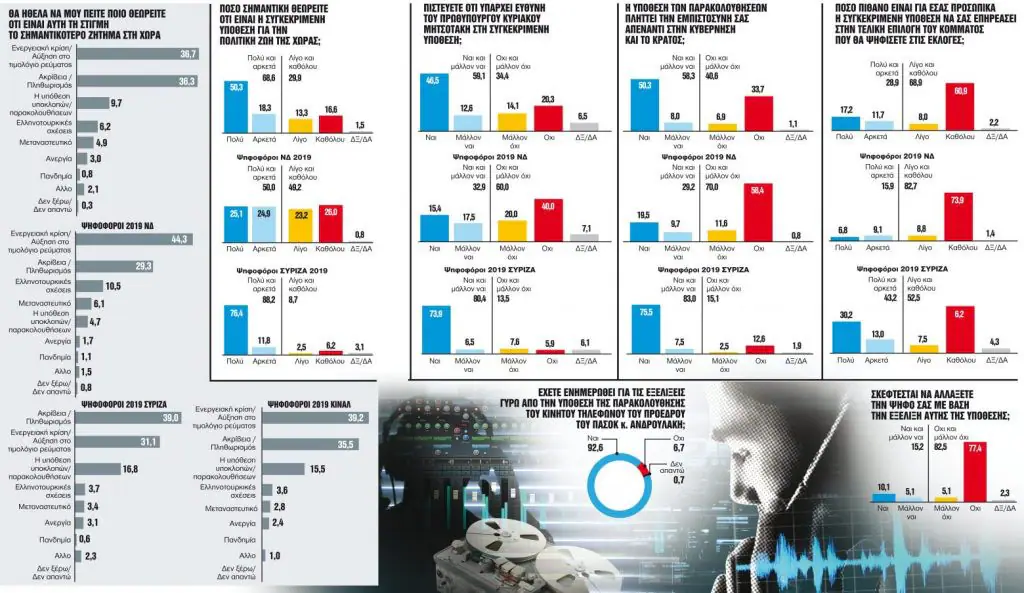 Η υπόθεση των τηλεφωνικών παρακολουθήσεων έχει εγείρει σειρά ερωτημάτων, προκαλεί αμηχανία στο εσωτερικό της ΝΔ και πλήττει το πρωθυπουργικό προφίλ του κ. Μητσοτάκη, καθώς το 59,1% θεωρεί ότι υπάρχει ευθύνη του Πρωθυπουργού.