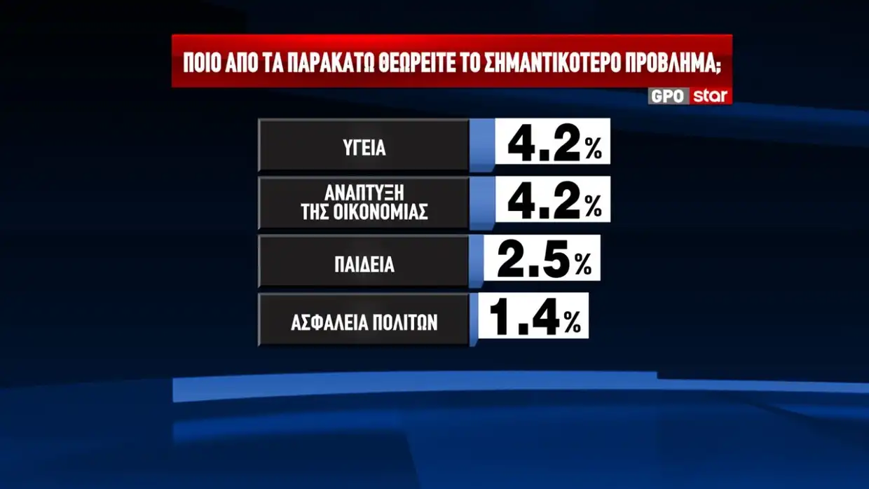Οι συμμετέχοντες στην έρευνα κρίνουν σε ποσοστό 57,8% την ακρίβεια και τα χαμηλά εισοδήματα ως το πιο σημαντικό πρόβλημα ενώ ακολουθεί η διαφθορά με 14,5% με το σκάνδαλο του ΟΠΕΚΕΠΕ να φαίνεται πως δίνει σημαντική ώθηση. Το 66,8% πιστεύει ότι επί κυβερνήσεων της ΝΔ η διαφθορά στην Ελλάδα έχει αυξηθεί.