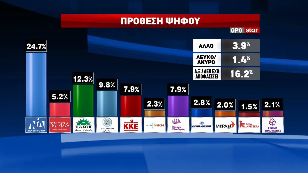 Συγκεκριμένα, η Νέα Δημοκρατία «οδηγεί την κούρσα» στην πρόθεση ψήφου με 24,7% και το ΠΑΣΟΚ ακολουθεί από απόσταση με 12,3%. η Ελληνική Λύση βρίσκεται στην τρίτη θέση με αμετακίνητο πυρήνα ψηφοφόρων και ποσοστό της τάξης του 9.8% ενώ ακολουθούν με 7,9% ΚΚΕ και Πλεύση Ελευθερίας. Ο ΣΥΡΙΖΑ καταγράφει ποσοστό 5,2% και κάτω από το 3% βρίσκονται Νίκη, Φωνή Λογικής, ΜέΡΑ25, Κίνημα Δημοκρατίας και Νέα Αριστερά.