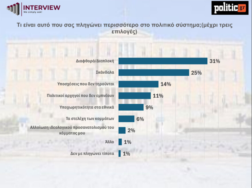 Στο ερώτημα, τέλος, τι πληγώνει περισσότερο το πολιτικό σύστημα, οι πολίτες απαντούν: η διαφθορά και η διαπλοκή με 31%, τα σκάνδαλα με 25%, οι ανεκπλήρωτες υποσχέσεις με 14%, η έλλειψη έμπνευσης από τους πολιτικούς αρχηγούς (11%) και η ανησυχία για “υποχωρητικότητα στα εθνικά θέματα” (9%).