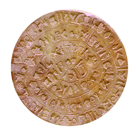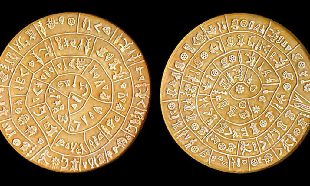 Ο δίσκος της Φαιστού, που διατηρείται ακέραιος, φέρει ιερογλυφική μινωική γραφή αποτυπωμένη σπειροειδώς και στις δύο πλευρές του.