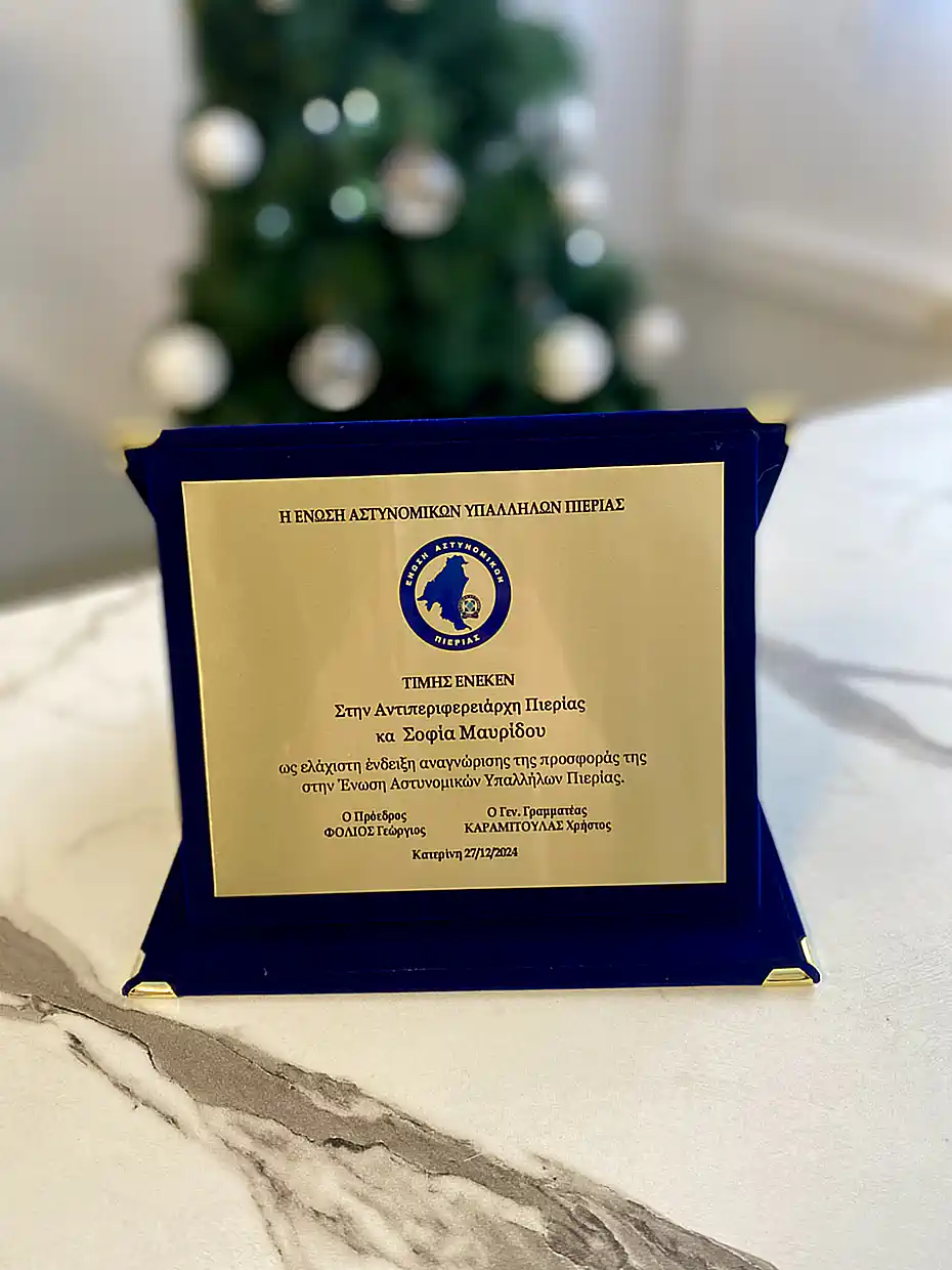 Η Ένωση Αστυνομικών Υπαλλήλων Πιερίας εκφράζει τις θερμές της ευχαριστίες στην Αντιπεριφερειάρχη Πιερίας, κα. Σοφία Μαυρίδου για την προσφορά της στη Διεύθυνση Αστυνομίας Πιερίας.