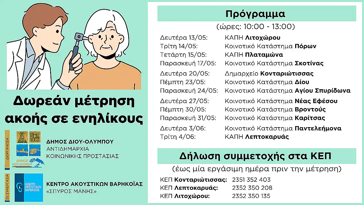 Ο Δήμος Δίου-Ολύμπου σε συνεργασία με το κέντρο ακουστικών βαρηκοΐας «Σπύρος Μάνης» παρέχει δωρεάν μέτρηση ακοής σε όποιον ενήλικο ενδιαφέρεται το διάστημα 13 Μαΐου έως και 4 Ιουνίου, σύμφωνα με το ακόλουθο πρόγραμμα: