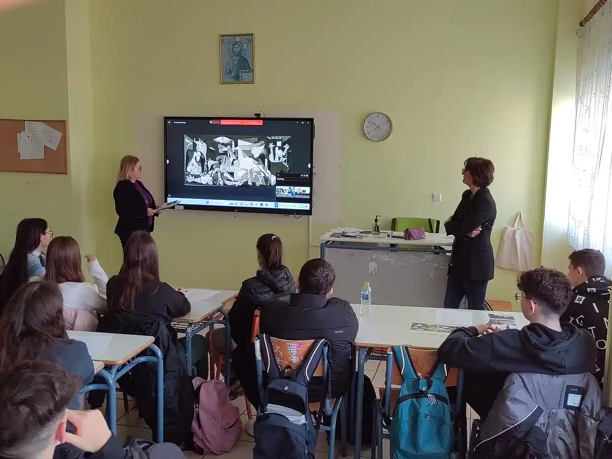 Στόχος ήταν από τη μια να γνωρίσουν οι μαθητές πώς να προσεγγίσουν ένα έργο τέχνης και να αντλήσουν πληροφορίες απαραίτητες για την κατανόηση και ερμηνεία ενός ιστορικού γεγονότος και από την άλλη να καλλιεργήσουν τον κριτικό εγγραμματισμό και την ενσυναίσθηση . Η διδασκαλία οργανώθηκε σε συνεργασία με τη φιλόλογο κ. Σοφία Χαριτοπούλου, ενώ την παρακολούθησαν, εξ αποστάσεως και σύγχρονα, οι φιλόλογοι που είναι αποσπασμένοι στο Ελληνικό Γυμνάσιο – Λύκειο Κολωνίας.