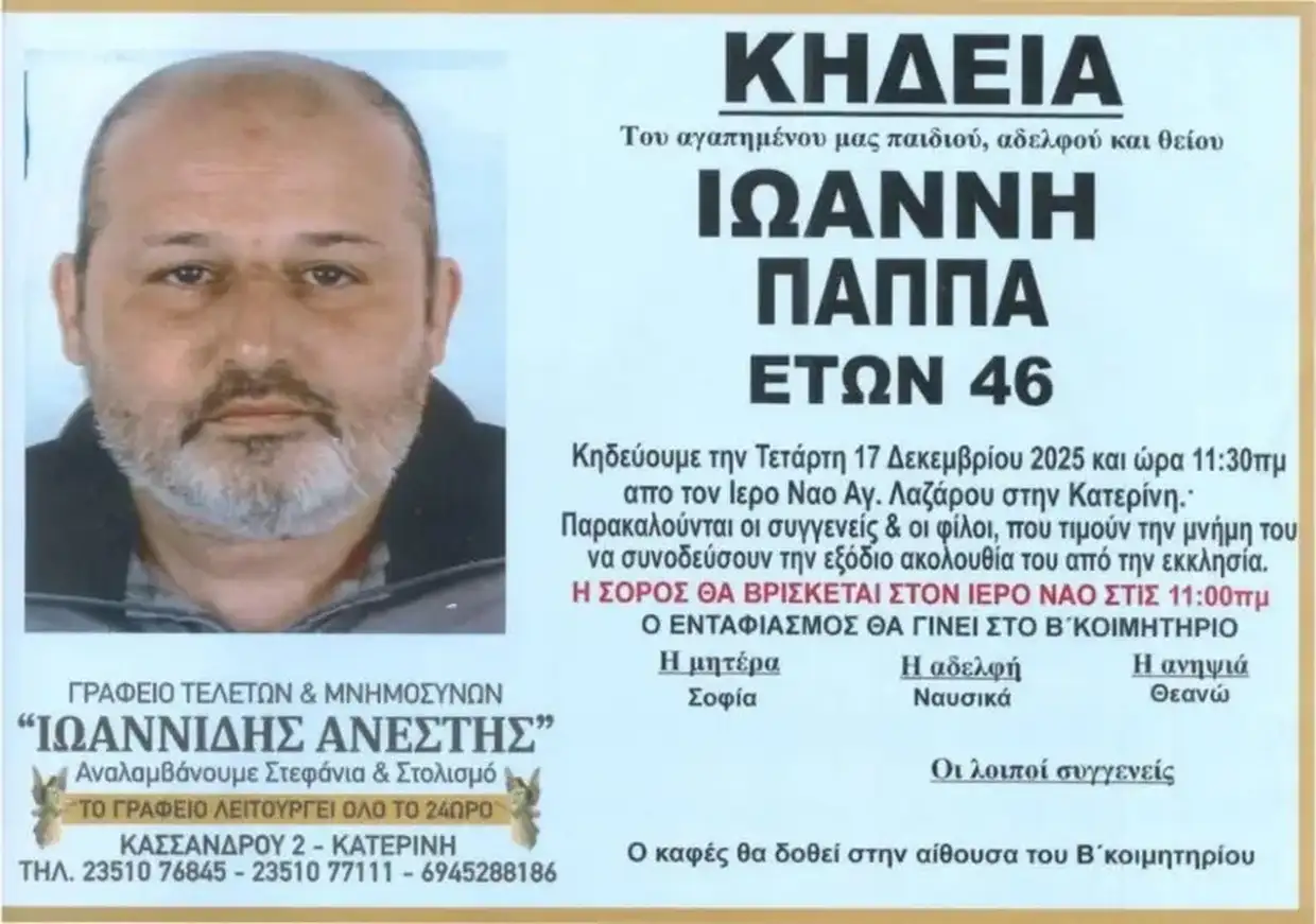 Έφυγε από τη ζωή ο Ιωάννης Παππάς σε ηλικία 46 ετών. 15 Δεκεμβρίου 2025