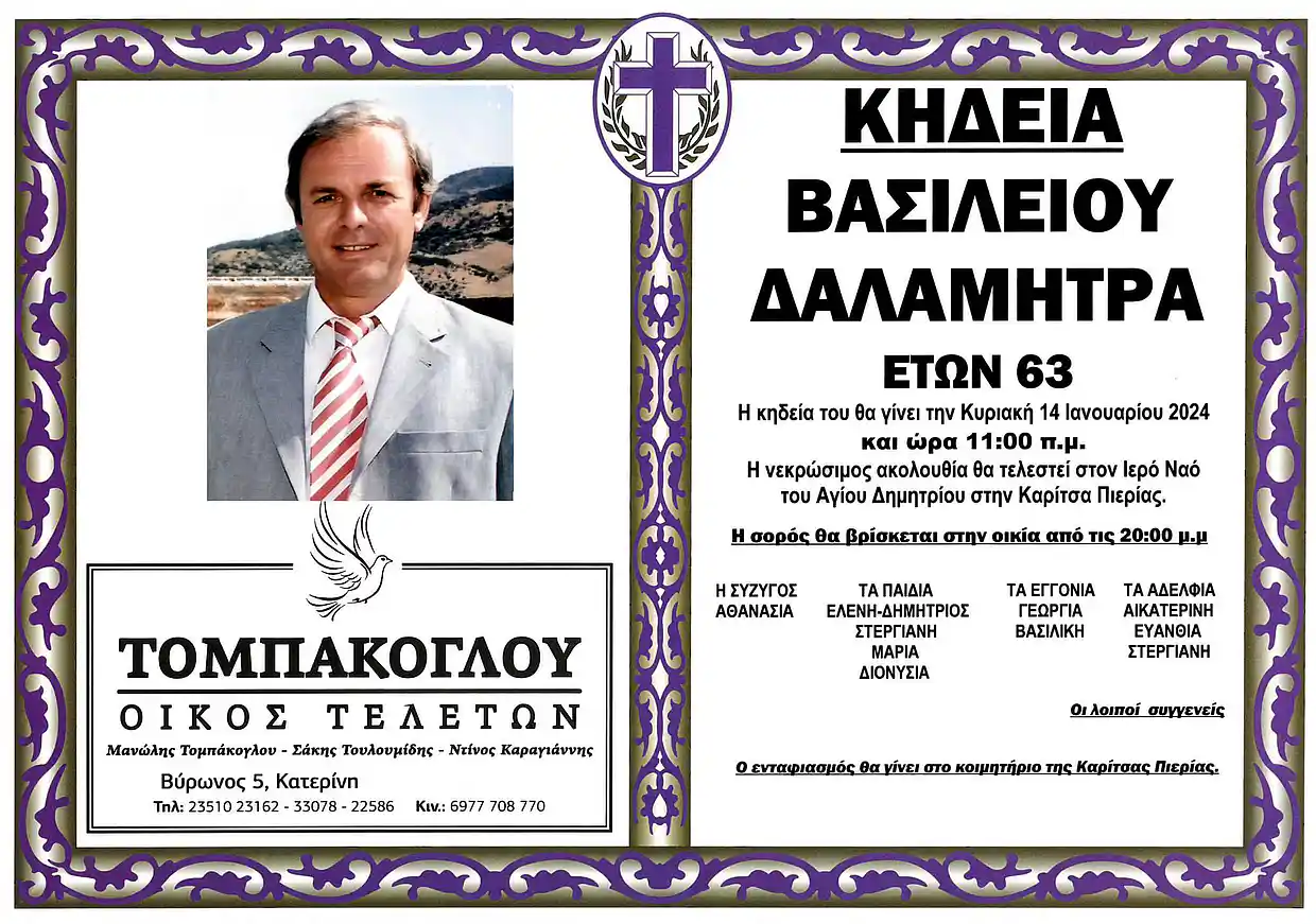 Η κηδεία του θα γίνει αύριο, Κυριακή 14 Ιανουαρίου 2024 και ώρα 11.00 το πρωί.