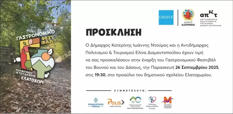 Την Παρασκευή 26 Σεπτεμβρίου 2025 και ώρα 19:30, ο Δήμος Κατερίνης και η Αντιδημαρχία Πολιτισμού & Τουρισμού σας προσκαλούν στο προαύλιο του Δημοτικού Σχολείου Ελατοχωρίου για τα εγκαίνια του Γαστρονομικού Φεστιβάλ Βουνού & Δάσους. Η εκδήλωση σηματοδοτεί την επίσημη έναρξη μιας γιορτής που αναδεικνύει τον πλούτο της τοπικής κουζίνας και προσφέρει μοναδικές εμπειρίες.