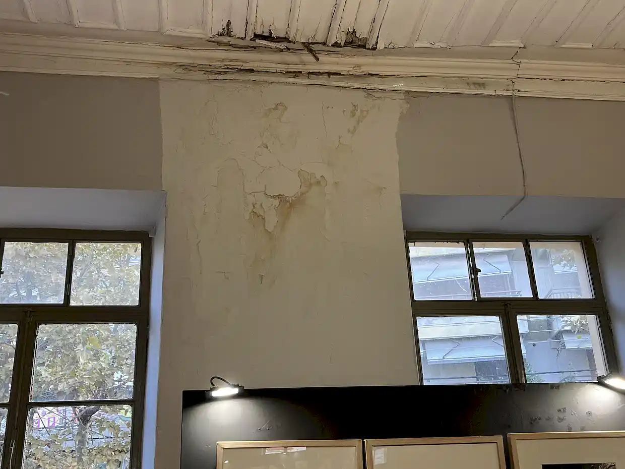 Οι εικόνες φυσικά μιλούν από μόνες τους, και διαφαίνεται ξεκάθαρα το έντονο πρόβλημα στεγανοποίησης του κτιρίου. Απορίας άξιο λοιπόν είναι πως επιτρέπεται μια τέτοια εικόνα σε ένα από τα εμβληματικά κτίρια της πόλης μας, που επίσης εγκυμονεί κινδύνους για τα έργα τέχνης που φιλοξενεί.