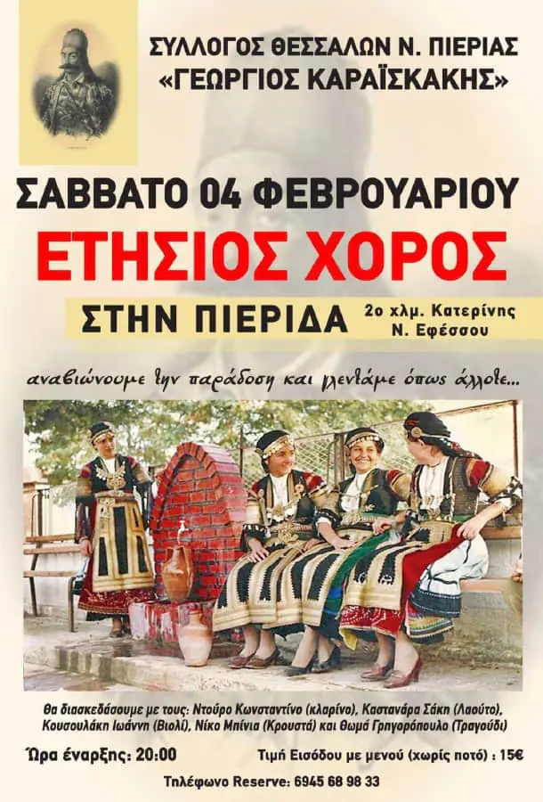 Ο Σύλλογος Θεσσαλών Ν.Πιερίας” Γεώργιος Καραισκάκης ” διοργανώνει ετήσιο χορό το Σάββατο 03 Φεβρουαρίου 2024 και ώρα 20:30μμ ..στην αίθουσα δεξιώσεων Ελια Πολυχώρος .