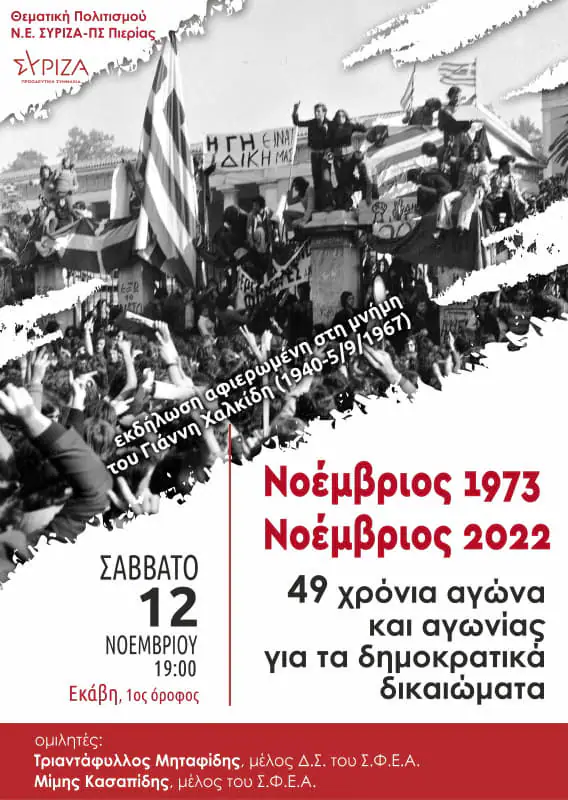 Το τμήμα Πολιτισμού της ΝΕ Πιερίας του ΣΥΡΙΖΑ – ΠΣ, στα πλαίσια των εκδηλώσεων για την εξέγερση του Πολυτεχνείου τον Νοέμβριο του 1973 ενάντια στην στρατιωτική φασιστική χούντα, διοργανώνει εκδήλωση αφιερωμένη στην μνήμη του αγωνιστή Γιάννη Χαλκίδη (1940 – 5/9.1967) το Σάββατο 12 Νοεμβρίου 2022 και ώρα 19.00 στην ΕΚΑΒΗ (1ος όροφος).