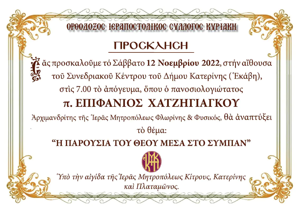 Υπό την αιγίδα της Ιεράς Μητροπόλεως Κίτρους, Κατερίνης και Πλαταμώνος, ο Ορθόδοξος Ιεραποστολικός Σύλλογος «ΚΥΡΙΑΚΗ», διοργανώνει εκδήλωση με ομιλητή τον αρχιμ. Επιφάνιο Χατζηγιάγκου, Φυσικό. Το θέμα που θα αναπτύξει είναι: «Η παρουσία του Θεού στο Σύμπαν». H εκδήλωση θα πραγματοποιηθεί στις 12 Νοεμβρίου 2022, ημέρα Σάββατο και ώρα 7 μ.μ. στο Συνεδριακό Κέντρο του Δήμου Κατερίνης.
