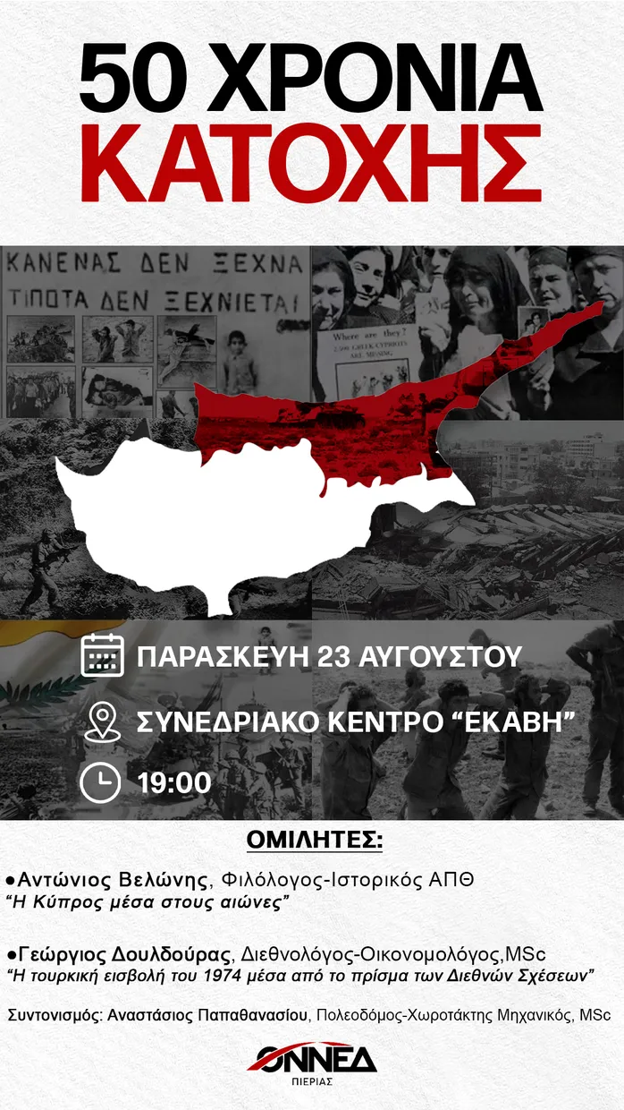 Συμπληρώνονται 50 χρόνια από την τουρκική εισβολή στην Κύπρο—πέντε δεκαετίες στρατιωτικής κατοχής και διαρκούς ανάγκης για δικαιοσύνη. Η ΟΝΝΕΔ Ν. Πιερίας σας προσκαλεί να παρακολουθήσετε την επιστημονική ημερίδα, όπου θα αναλυθούν τα γεγονότα υπό το πρίσμα της ιστορικής επιστήμης και των διεθνών σχέσεων. Από τα γεγονότα που οδήγησαν στην εισβολή και την κατοχή, μέχρι τη σημερινή κατάσταση και την αναγκαιότητα επίλυσης του κυπριακού ζητήματος, η ημερίδα αυτή θα προσφέρει μια ολοκληρωμένη ανάλυση και κατανόηση της ιστορικής διαδρομής.