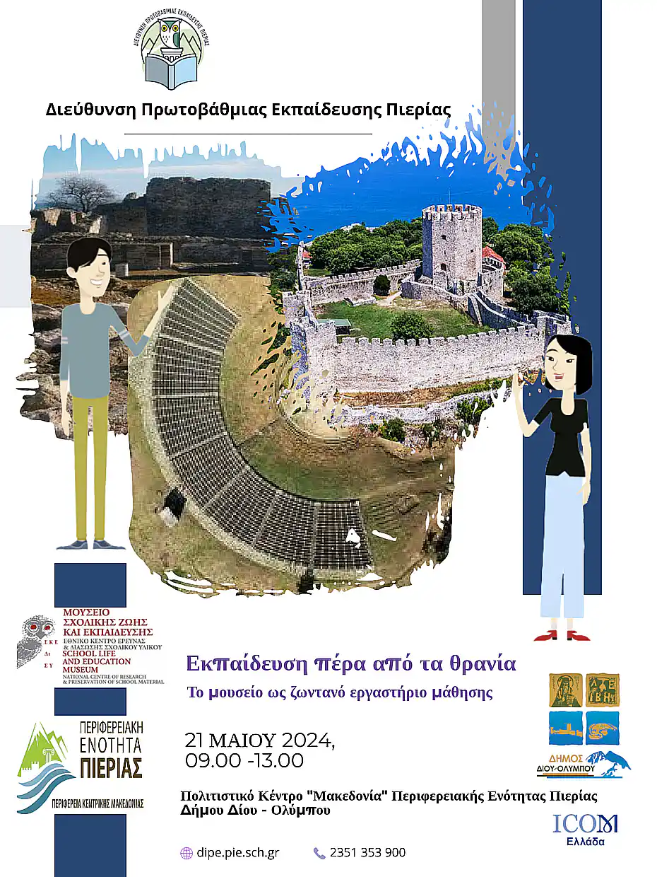 Η Διεύθυνση της Πρωτοβάθμιας Εκπαίδευσης Πιερίας και το Μουσείο Σχολικής Ζωής και Εκπαίδευσης του Εθνικού Κέντρου Διάσωσης Σχολικού Υλικού (ΕΚΕΔΙΣΥ), διοργανώνουν σε συνεργασία με την Αντιπεριφέρεια Πιερίας και τον Δήμο Δίου – Ολύμπου, Εκπαιδευτική Ημερίδα με τη θεματική: