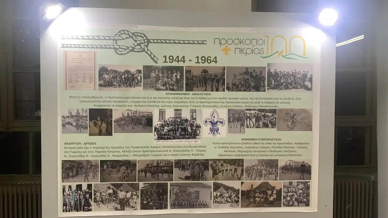 Η έκθεση αποτύπωσε το χρονικό της προσκοπικής δράσης στην Πιερία από το 1924 έως σήμερα, μέσα από αγνώριστες αλλά πολύτιμες φωτογραφίες, ντοκουμέντα και μαρτυρίες. Παλαιοί Πρόσκοποι αναγνώριζαν τον εαυτό τους σε στιγμιότυπα περασμένων δεκαετιών και μοιράζονταν ιστορίες που είχαν χαραχθεί ανεξίτηλα στη μνήμη.