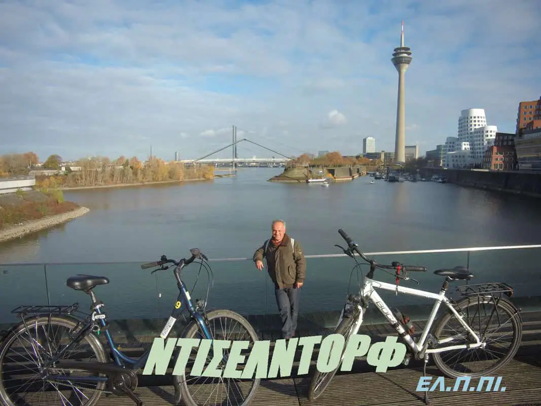 Η καλύτερη όμως ποδηλατική εμπειρία μας ήταν όταν ποδηλατίσαμε στο Ντίσελντορφ ! Το Ντύσελντορφ είναι στην Γερμανία και πρωτεύουσα του κρατιδίου της Βόρειας Ρηνανίας-Βεστφαλίας. Με πληθυσμό περισσότερο από 500.000 κατοίκους. Είναι ένα από τα μεγαλύτερα πολιτιστικά, αλλά επίσης και οικονομικά , διοικητικά κέντρα του κρατιδίου. Σημαντική επίσης είναι η εμπορική δραστηριότητα του Ντύσελντορφ, με το λιμάνι του στο Ρήνο. Δέν είναι σίγουρα (από ότι μας είπαν) από τις καλύτερες ποδηλατουπόλεις της Γερμανίας αλλά δεν είχαμε κανένα πρόβλημα να κυκλοφοράμε ,οπουδήποτε (σχεδόν) υπήρχαν ποδηλατόδρομοι! Βρήκαμε εύκολα και νοικιάσαμε πολύ οικονομικά ποδήλατα για να κυκλοφορούμε. Συνήθως η διαμονή μας σε κάθε κράτος ή πόλη είναι από 3-5 ημέρες και διανύουμε καθημερινά από 30-70χλμ. Το κόστος μεταφοράς, με πολύ ψάξιμο αεροπορικώς κυμαίνεται απο 100-200€ …