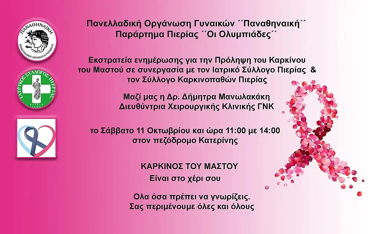 Τη δράση ενημέρωση για τον καρκίνου του μαστού διοργανώνει το Παράρτημα Πιερίας “οι Ολυμπιάδες” της “Παναθηναϊκής” Πανελλαδικής Οργάνωσης Γυναικών, με σκοπό την ευαισθητοποίηση του κοινού.