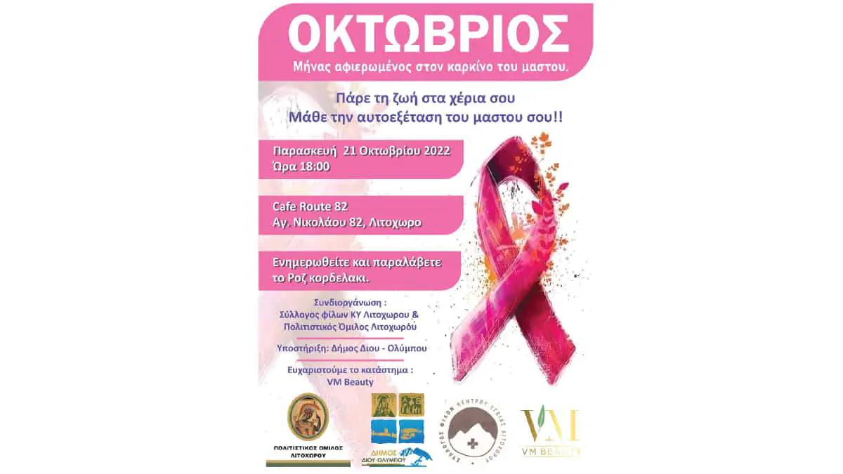 Με σύνθημα «Πάρε τη ζωή στα χέρια σου. Μάθε την αυτοεξέταση του μαστού σου!!» ο Σύλλογος Φίλων Κέντρου Υγείας Λιτοχώρου και ο Πολιτιστικός Όμιλος Λιτοχώρου διοργανώνουν ενημερωτική εκδήλωση για την πρόληψη κατά του καρκίνου του μαστού την Παρασκευή 21 Οκτωβρίου 2022.