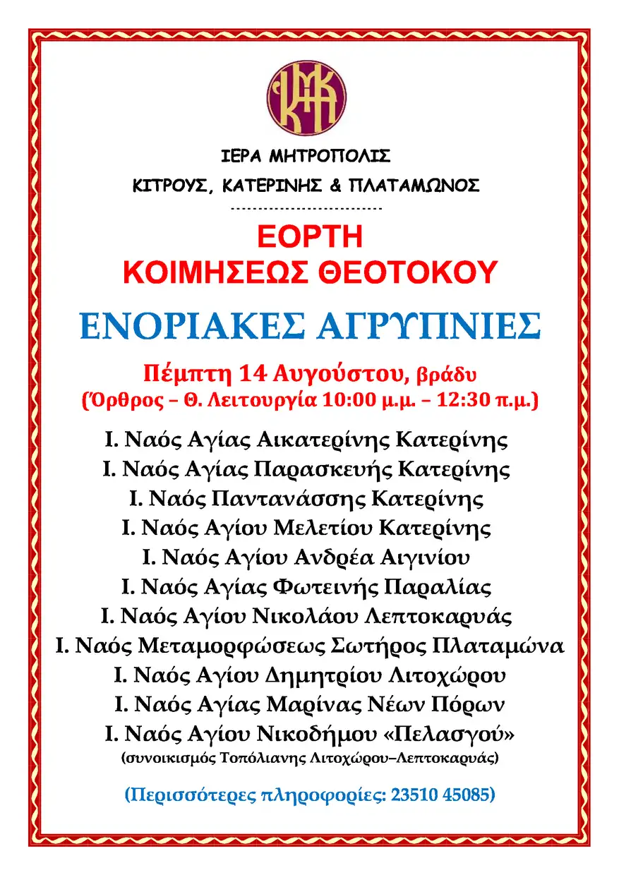 Η Ιερά Μητρόπολη ανακοινώνει τις ενοριακές αγρυπνίες που θα πραγματοποιηθούν ενόψει της εορτής κοιμήσεως της Θεοτόκου