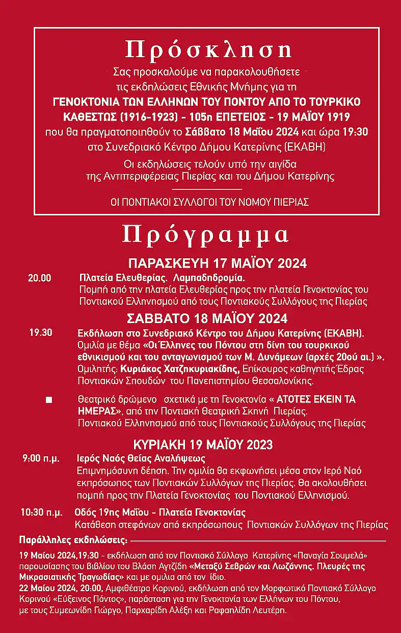 Η Ένωση Ποντίων Πιερίας προσκαλεί τα μέλη και τους φίλους του συλλόγου στις εκδηλώσεις Μνήμης της Γενοκτονίας του Ποντιακού Ελληνισμού που πραγματοποιούν οι Ποντιακοί σύλλογοι της Πιερίας.