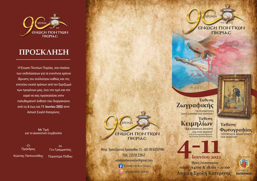 Η Ένωση Ποντίων Πιερίας, στο πλαίσιο των εκδηλώσεων για τα ενενήντα χρόνια ίδρυσης του συλλόγου καθώς και της επετείου των εκατό χρόνων από τον ξεριζωμό των προγόνων μας, έχει την τιμή και την χαρά να σας προσκαλέσει στην πολυθεματική έκθεση που διοργανώνει από τις 4 έως και 11 Ιουνίου 2022 στην Αστική σχολή Κατερίνης.