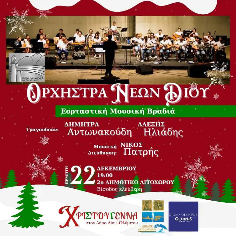 Η Ορχήστρα Νέων Δίου υπό τη μουσική διεύθυνση του Νίκου Πατρή θα πραγματοποιήσει απόψε (Πέμπτη 22 Δεκεμβρίου) στις 7μ.μ. μία μεγάλη εορταστική μουσική βραδιά στην αίθουσα εκδηλώσεων του 2ου Δημοτικού Σχολείου Λιτοχώρου.