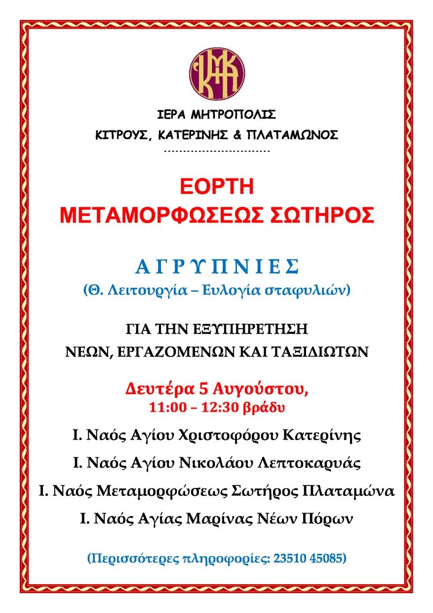 Ολύμπιο Βήμα » Πιερία » Εορτή Μεταμορφώσεως Σωτήρος στην Ιερά Μητρόπολη Κίτρους, Κατερίνης και Πλαταμώνος