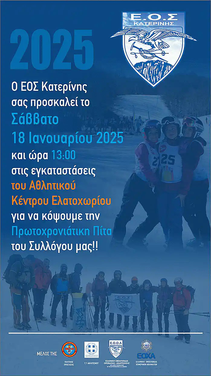 Ο Πρόεδρος και το Δ.Σ. του Ελληνικού Ορειβατικού Συλλόγου Κατερίνης – ΕΟΣ ΚΑΤΕΡΙΝΗΣ, σας προσκαλούν το Σάββατο 18 Ιανουαρίου 2025 και ώρα 13.00, στην κοπή της πρωτοχρονιάτικης πίτας που θα γίνει στις εγκαταστάσεις του Αθλητικού μας Κέντρου, στο Χιονοδρομικό Ελατοχωρίου (πάρκινγκ στην βάση του εναέριου αναβατήρα «Δίας»).