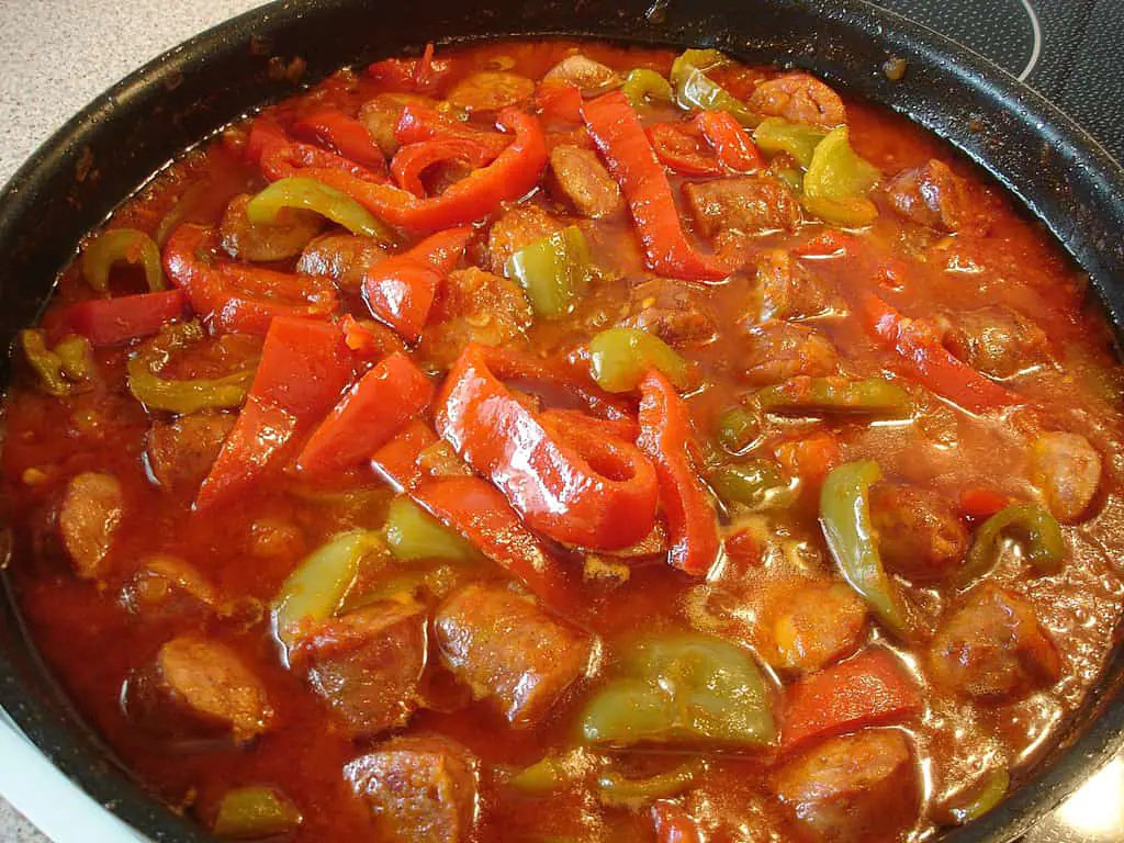 Σε βαθύ τηγάνι σοτάρουμε στο ελαιόλαδο τις πιπεριές και τα λουκάνικα μέχρι να ροδίσουν.