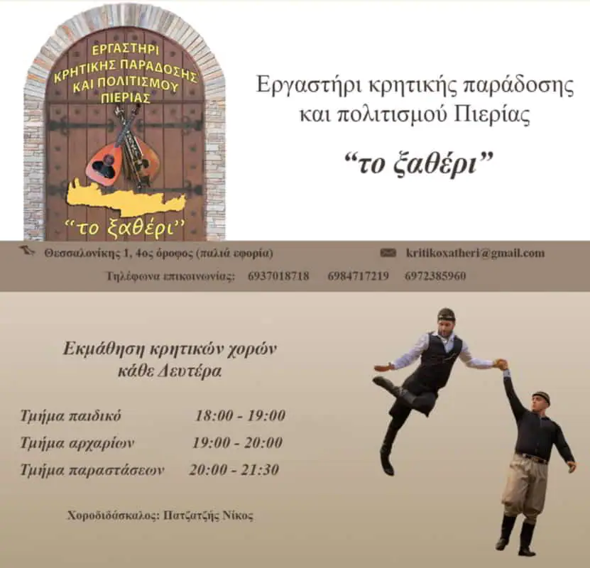 Το Εργαστήρι κρητικής παράδοσης και πολιτισμού «Το ξαθέρι», καλεί όλα τα μέλη και τους φίλους του στον αγιασμό για την έναρξη της νέας πολιτιστικής περιόδου, την Κυριακή 18 Σεπτεμβρίου 2022 και ώρα 7 μ.μ., στα γραφεία του Συλλόγου μας, Θεσσαλονίκης 1, 4ος όροφος (στο κτίριο της παλιάς Εφορίας).