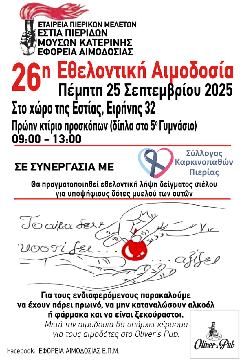 Ο Σύλλογος Καρκινοπαθών και η Εστία Πιερίδων Μουσών Κατερίνης διοργανώνουν την 26η εθελοντική αιμοδοσία. Έλα να δώσεις αίμα και να χαρίσεις ζωή!