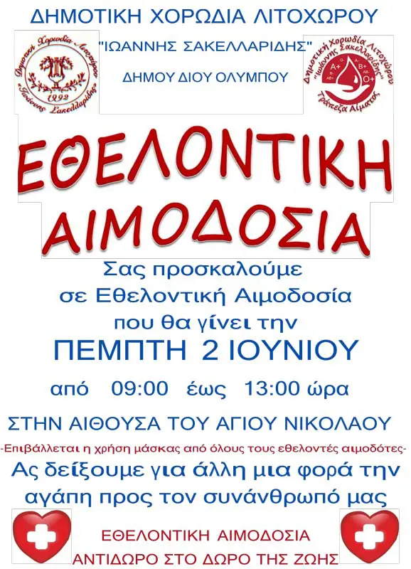 Σας προσκαλούμε σε Εθελοντική Αιμοδοσία που θα γίνει την ΠΕΜΠΤΗ 2 ΙΟΥΝΙΟΥ από 09:00 έως 13:00 ώρα ΣΤΗΝ ΑΙΘΟΥΣΑ ΤΟΥ ΑΓΙΟΥ ΝΙΚΟΛΑΟΥ