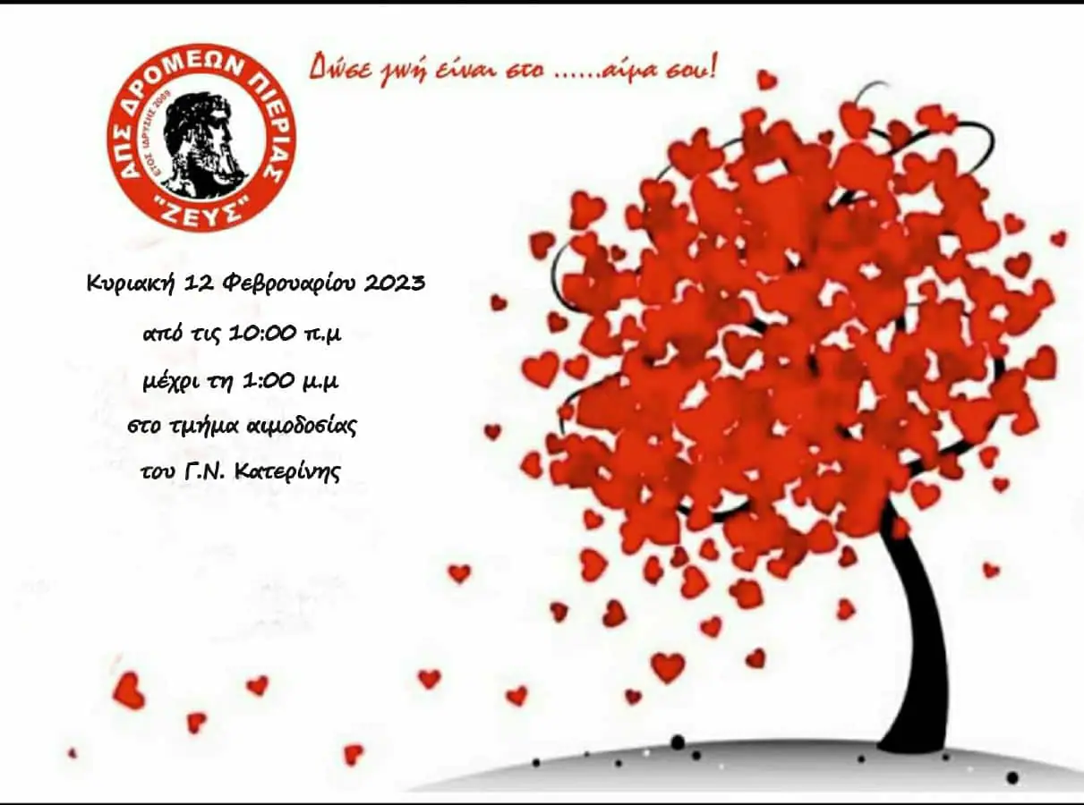 Σας προσκαλούμε στην ετήσια τακτική εθελοντική αιμοδοσία του Συλλόγου μας, την Κυριακή 12 Φεβρουαρίου 2023 στο τμήμα αιμοδοσίας του Γ.Ν. Κατερίνης.