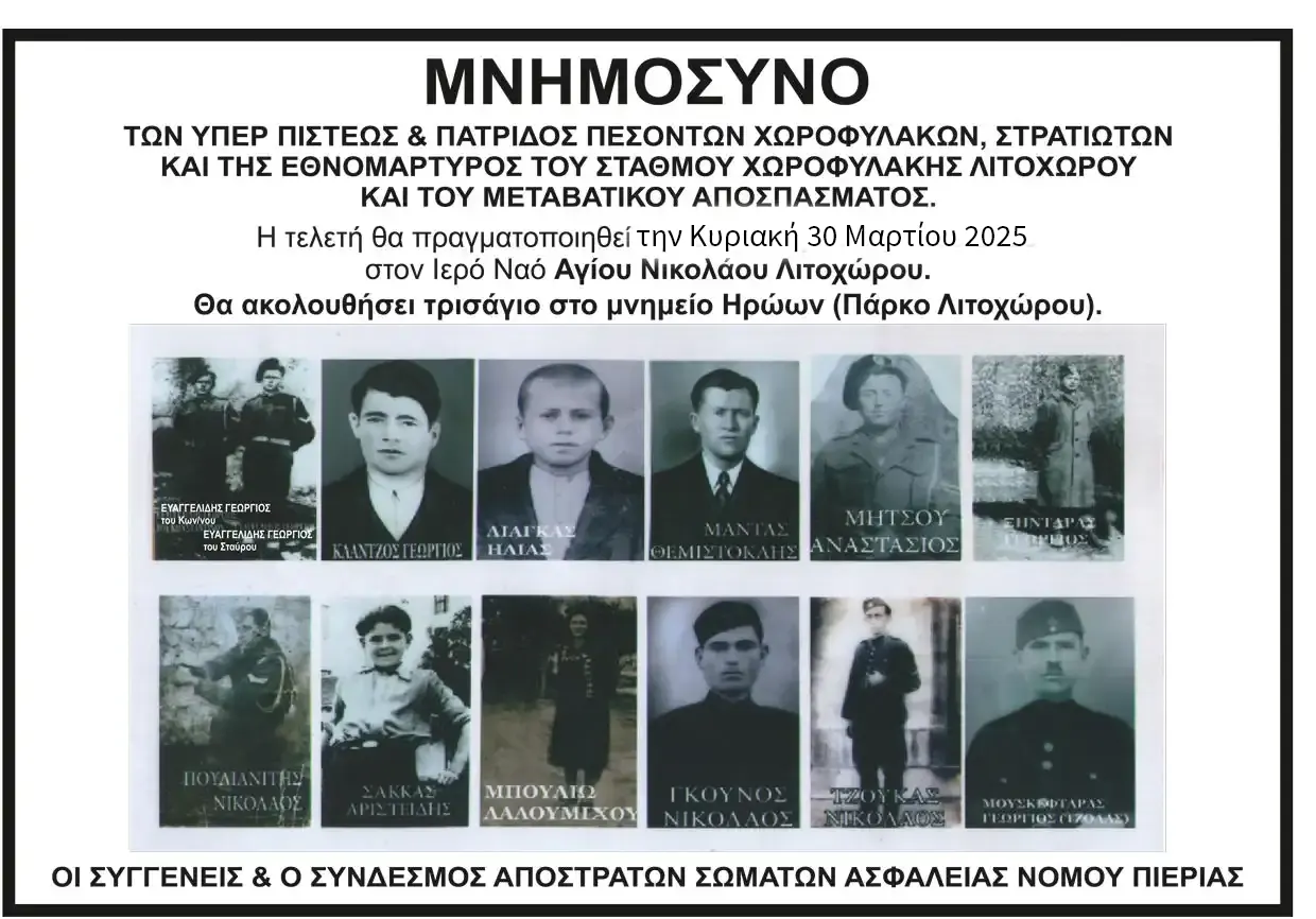Σας γνωρίζουμε ότι την Κυριακή 30 Μαρτίου 2025 στο Λιτόχωρο Πιερίας, θα τελεστεί το ετήσιο μνημόσυνο, υπέρ αναπαύσεως των ψυχών, των υπέρ Πίστεως και Πατρίδος πεσόντων ανδρών της Ελληνικής Χωροφυλακής, του Ελληνικού Στρατού και της Εθνομάρτυρος, κατά την ομώνυμη μάχη του Σταθμού Χωροφυλακής Λιτοχώρου, την νύχτα της 30/31-3-1946, παραμονή εκλογών.