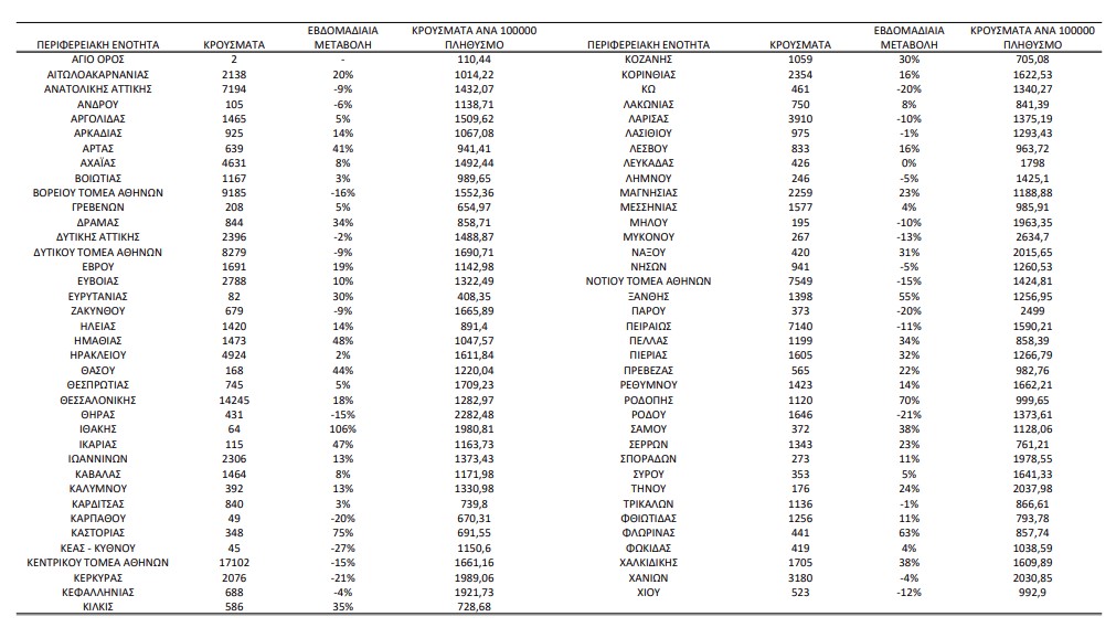 Κατανομή κρουσμάτων την εβδομάδα αναφοράς: Στο Πίνακα 1 παρουσιάζεται τo σύνολο των κρουσμάτων, η επίπτωση ανά 100.000 πληθυσμού καθώς και η εβδομαδιαία μεταβολή των επιβεβαιωμένων κρουσμάτων COVID-19 ανά περιφερειακή ενότητα την εβδομάδα αναφοράς σε σύγκριση με την προηγούμενη εβδομάδα.
