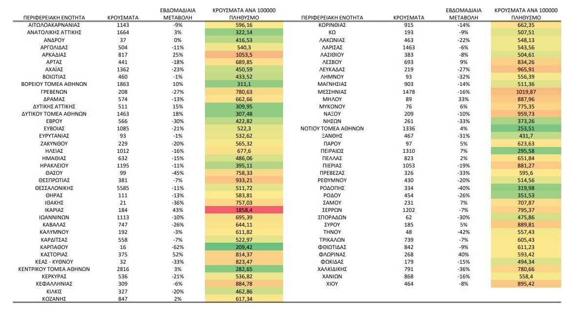 Κατανομή κρουσμάτων την εβδομάδα αναφοράς: Στο Πίνακα 1 παρουσιάζεται τo σύνολο των κρουσμάτων, η επίπτωση ανά 100.000 πληθυσμού καθώς και η εβδομαδιαία μεταβολή των επιβεβαιωμένων κρουσμάτων COVID-19 ανά περιφερειακή ενότητα την εβδομάδα αναφοράς σε σύγκριση με την προηγούμενη εβδομάδα.