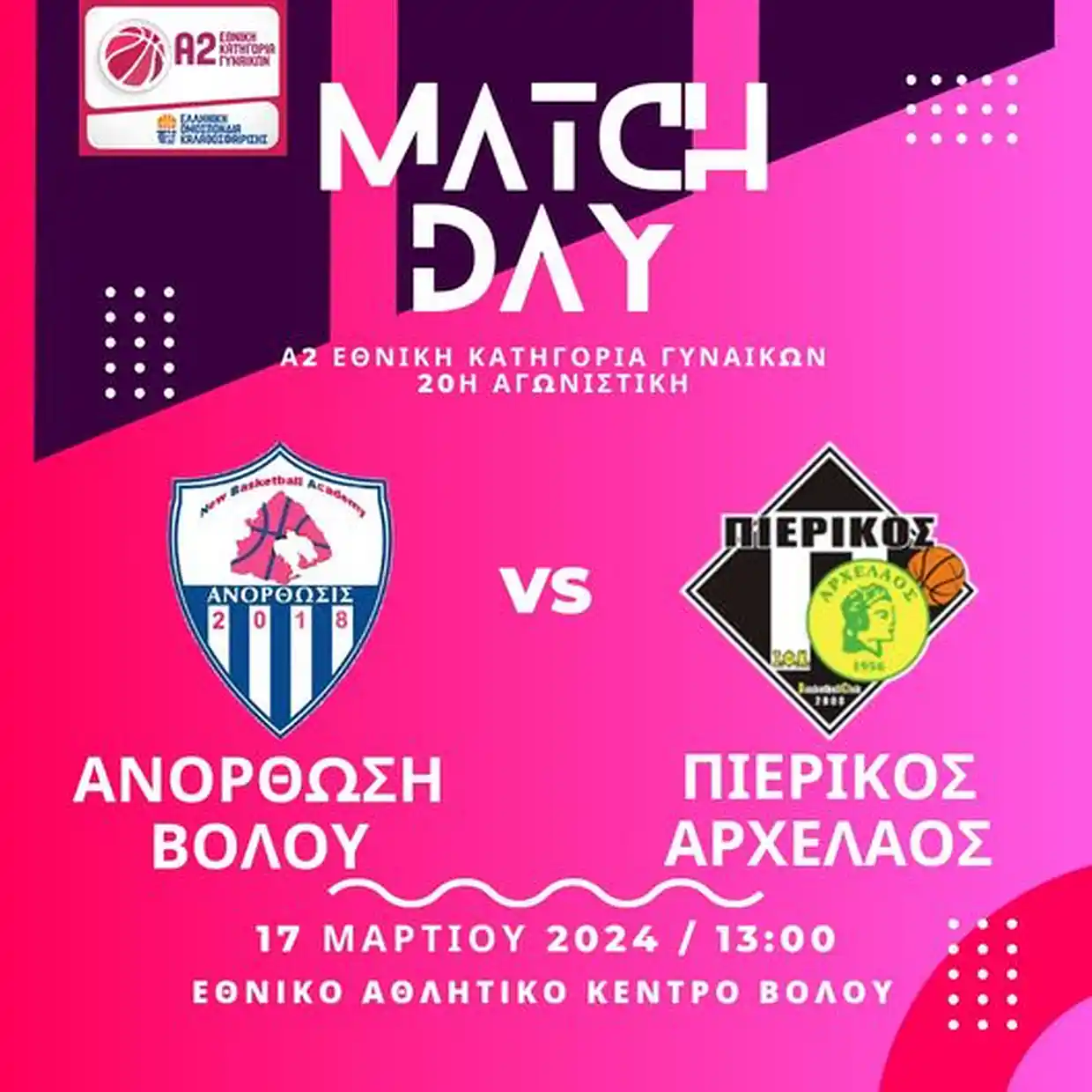 Την Ανόρθωση Βόλου (11-4) αντιμετωπίζει ο Πιερικός Αρχέλαος (8-9) την Κυριακή 17 Μαρτίου στις 13:00, στο Εθνικό Αθλητικό Κέντρο Βόλου, στο πλαίσιο της 20ης αγωνιστικής του 2ου ομίλου της Α2 Εθνικής Κατηγορίας Γυναικών.