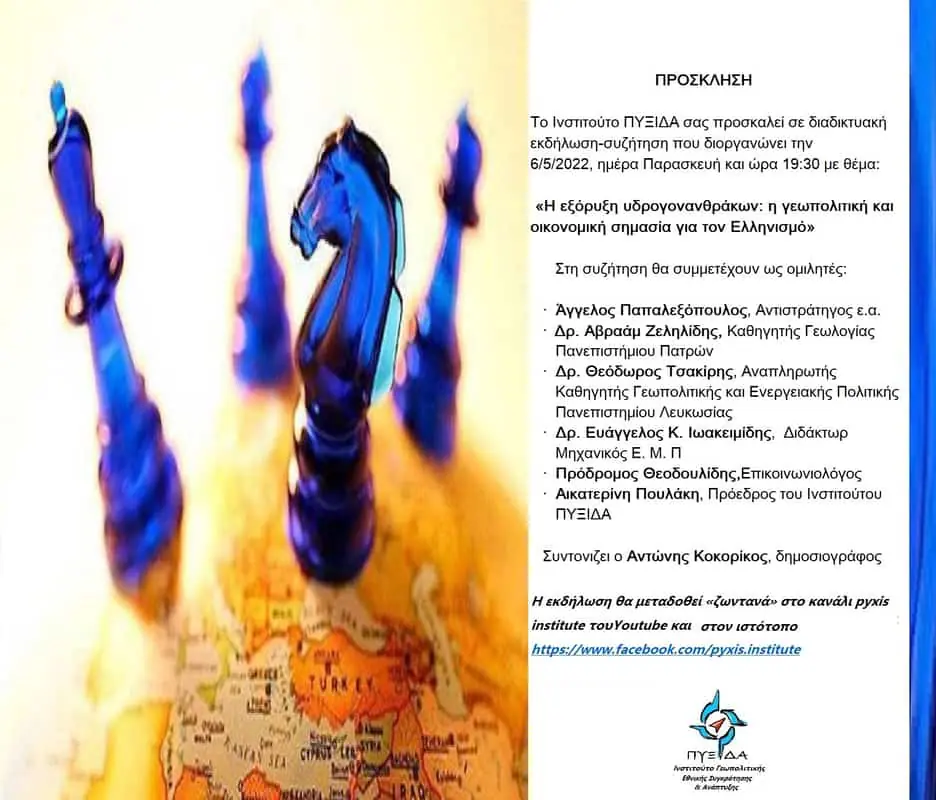 Το Ινστιτούτο Γεωπολιτικής, Εθνικής Συγκρότησης και Ανάπτυξης ΠΥΞΙΔΑ, επ’ αφορμή της ενεργειακής κρίσης που έχει ανακύψει σε διεθνές αλλά και σε ευρωπαϊκό επίπεδο αλλά και των επίμονων τουρκικών διεκδικήσεων στο Αιγαίο,  διοργανώνει διαδικτυακή εκδήλωση – συζήτηση  με θέμα «η εξόρυξη υδρογονανθράκων: η γεωπολιτική και οικονομική σημασία για τον Ελληνισμό», η οποία θα πραγματοποιηθεί την  6/5/2022, ημέρα Παρασκευή και ώρα 19:30, υπό την αιγίδα του.