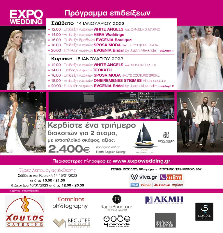Αν λοιπόν παντρεύεστε ή βαπτίζετε μην χάσετε το μεγάλο ραντεβού της χρονιάς 14-16 Ιανουαρίου 2023, για να οργανώσετε το γάμο ή την βάπτιση του παιδιού σας ευκολά και γρήγορα επιλέγοντας παράλληλα τους κατάλληλους συνεργάτες που θα εκπληρώσουν το όνειρο σας για ένα μοναδικό event.