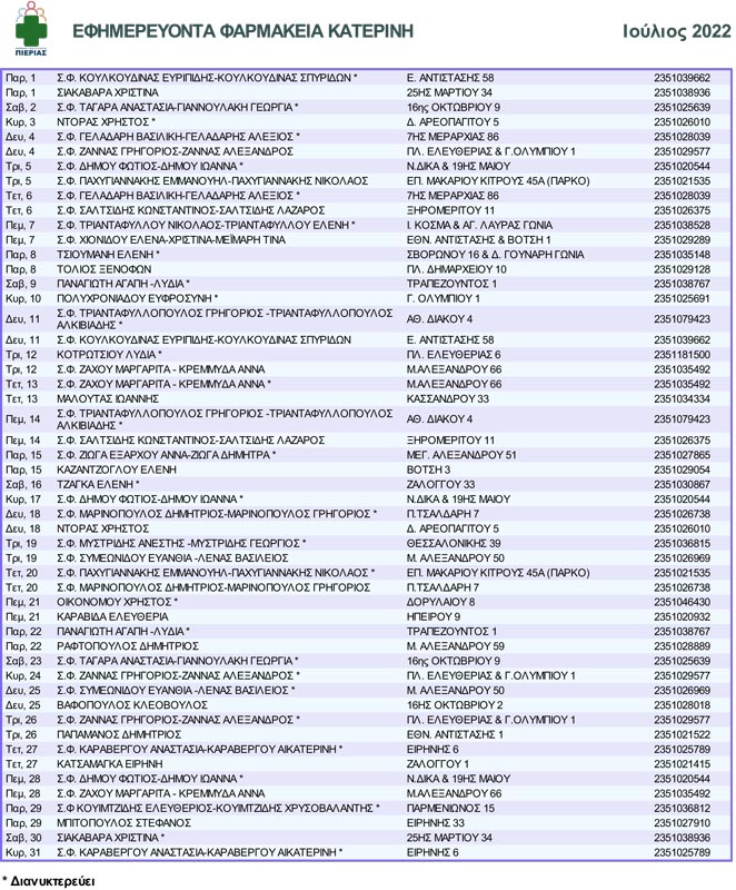 Φαρμακευτικός Σύλλογος Πιερίας: Κατερίνη – Ανανεωμένο Πρόγραμμα Ιουλίου 2022