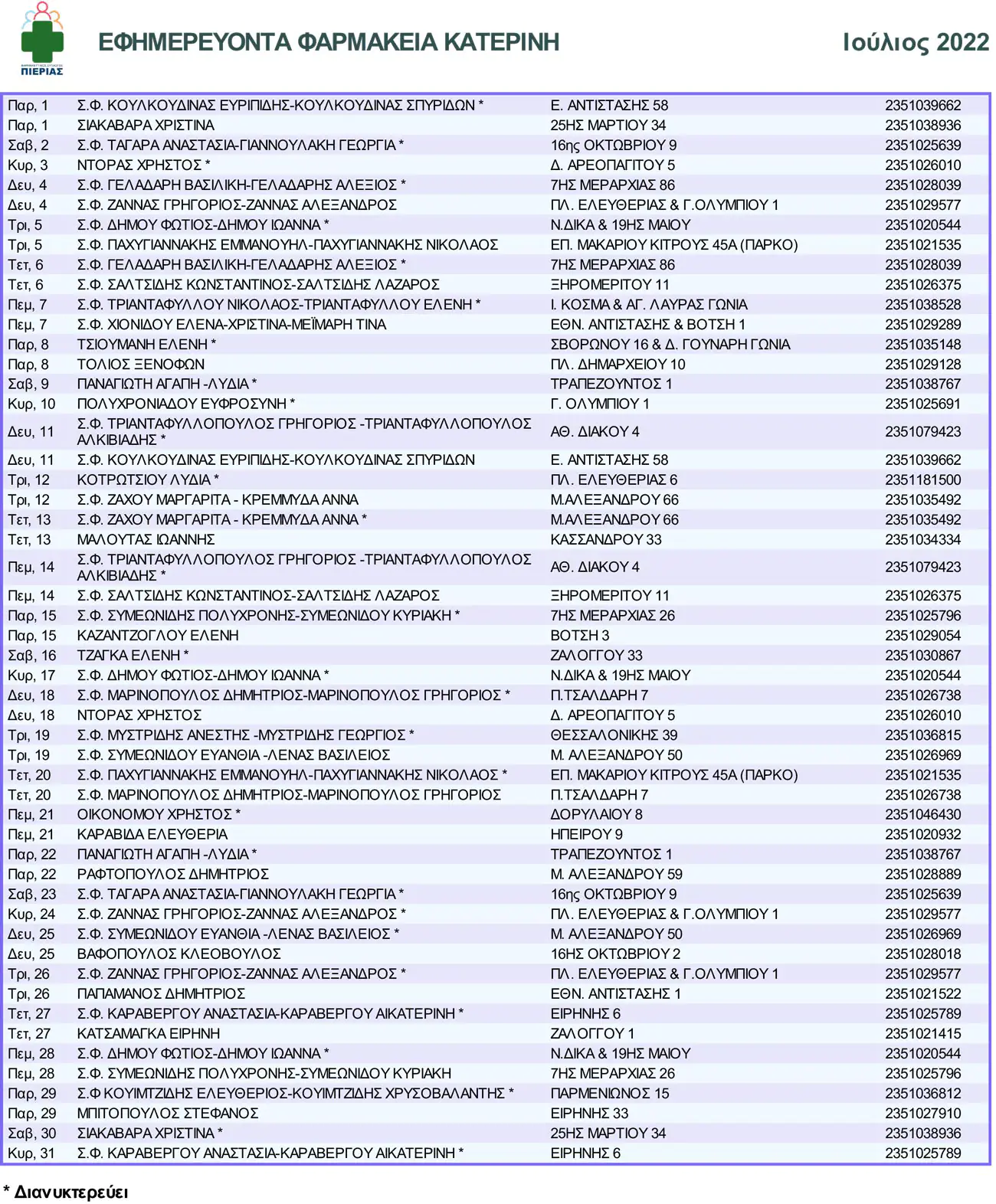 Φαρμακευτικός Σύλλογος Πιερίας: Κατερίνη – Πρόγραμμα Ιουλίου 2022