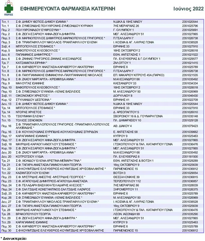 Φαρμακευτικός Σύλλογος Πιερίας: Κατερίνη – Πρόγραμμα Ιουνίου 2022