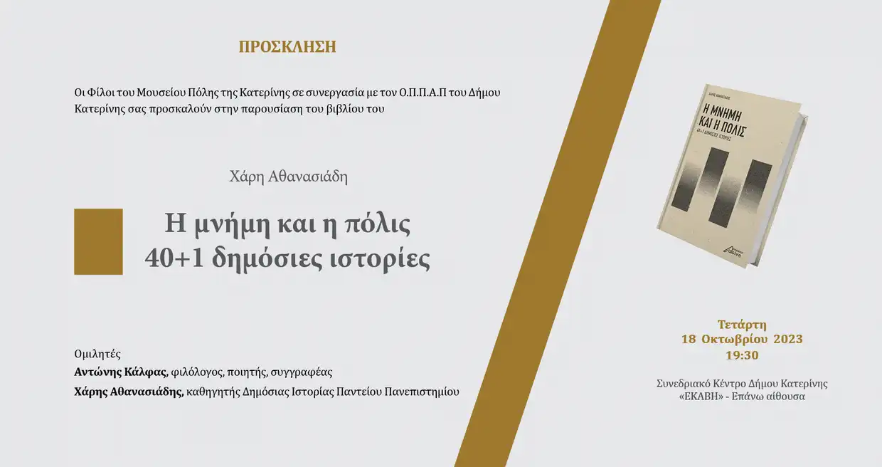 Οι Φίλοι Μουσείου Πόλης Κατερίνης σας προσκαλούν στην παρουσίαση του βιβλίου του καθηγητή του Πάντειου Πανεπιστημίου και του Ε.Α.Π Χάρη Αθανασιάδη με τίτλο “Η μνήμη και η πόλις. 40+1 δημόσιες ιστορίες”.