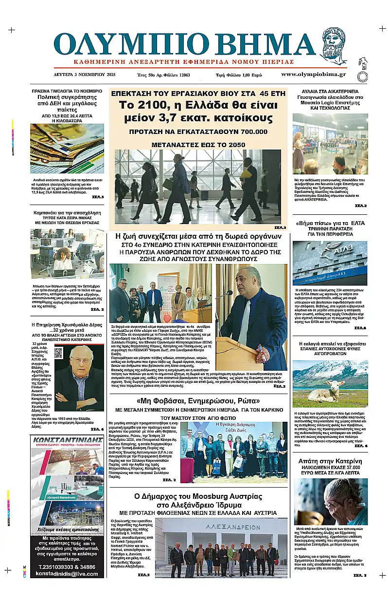 Το πρωτοσέλιδο της εφημερίδας Ολύμπιο Βήμα για την Δευτέρα, 03 Νοεμβρίου 2025