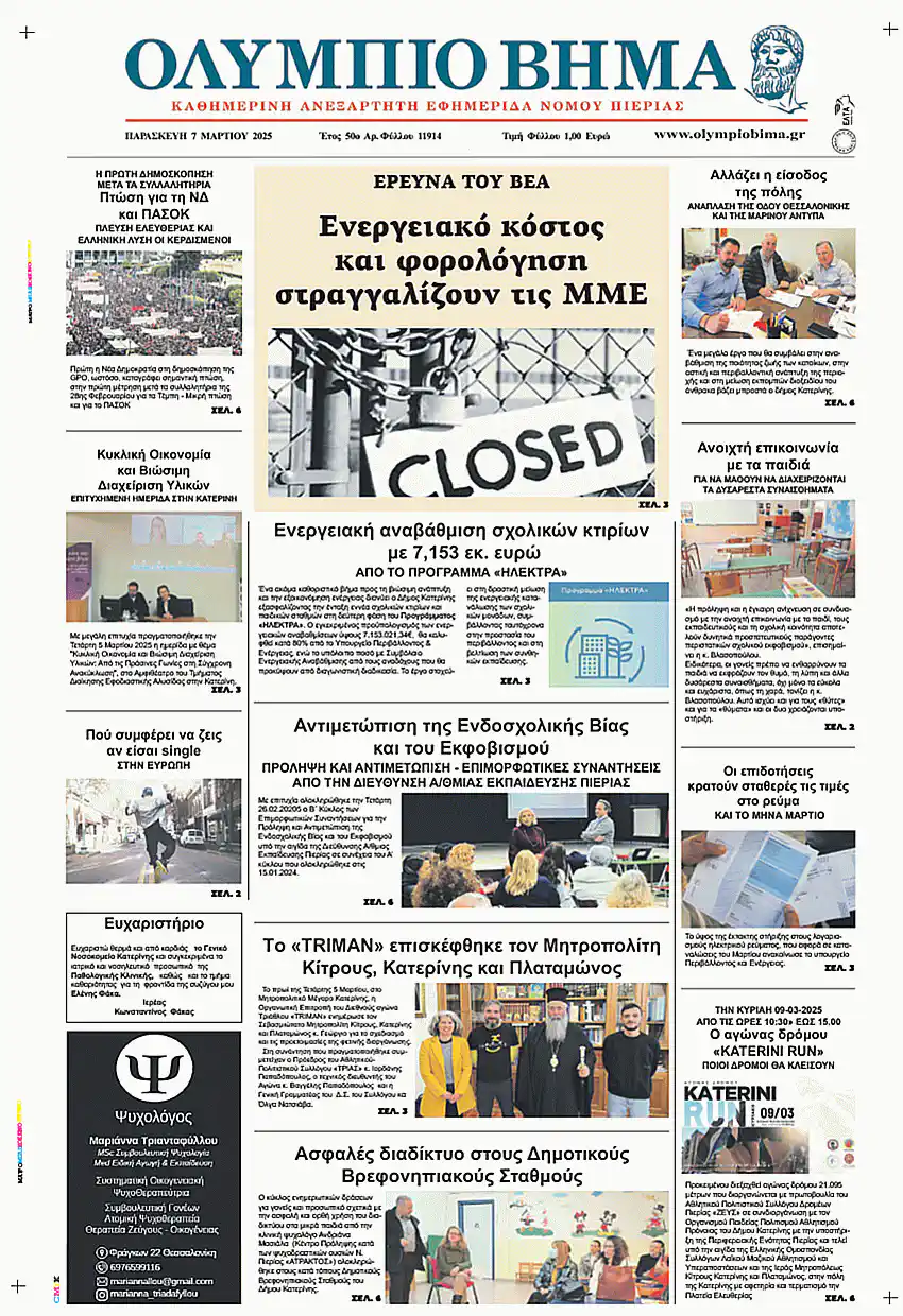 Ολύμπιο Βήμα – Πρωτοσέλιδο για την Παρασκευή, 07 Μαρτίου 2025