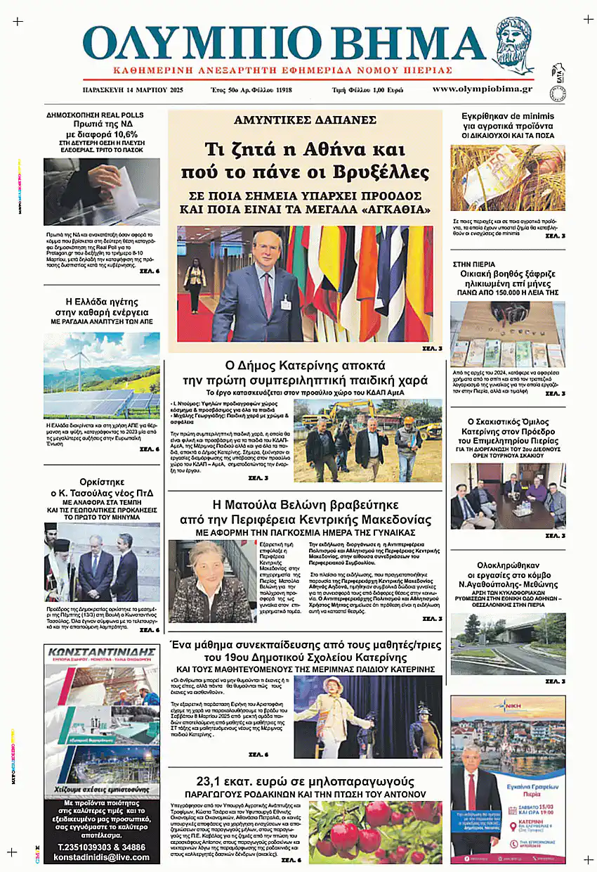 Το πρωτοσέλιδο της εφημερίδας Ολύμπιο Βήμα για την Παρασκευή, 14 Μαρτίου 2025